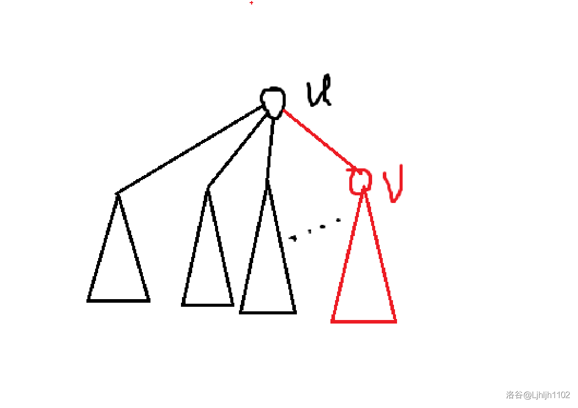 黑色的子树是前面已经遍历过的子树,我们已经从前面的子树之中合并出了 fu,k,现在遍历了 v 节点。现在显然有三种情况可以合并出 fu,k:
