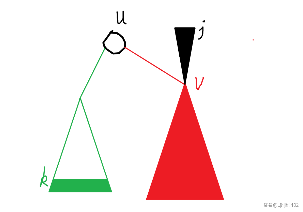 我们以第三种情况为例子。如图,绿色子树代表前面我们已经遍历过的子树,实色部分表示 k 层以下已经覆盖完,空白部分表示 k 层以上没有完全被覆盖。红色子树也就是 v 子树,表示 v 子树已经覆盖完,黑色倒三角就表示 v 子树还能向外再覆盖 j 层。